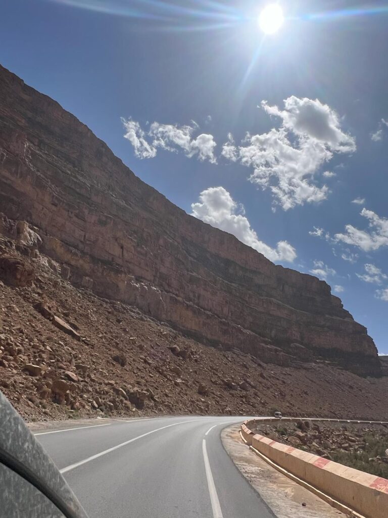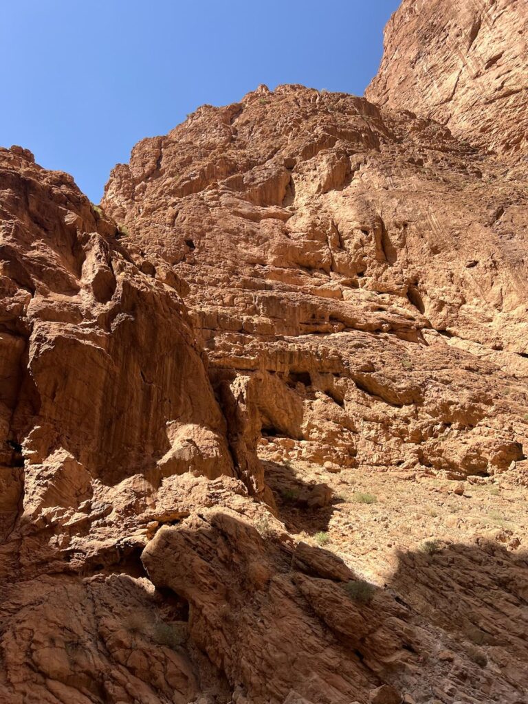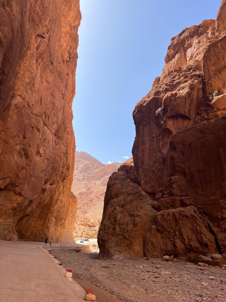 Na ons avontuur in de Sahara reisden we verder naar Tinghir. Na ongeveer 3 uur rijden kom je aan in dit kleine dorpje, gelegen middenin de Todrakloof. De kloof doet denken aan een kleinere versie van de Grand Canyon, met steile rotswanden en smalle doorgangen. Het is een ideale stop om onderweg te overnachten en de indrukwekkende natuur van de kloof in je op te nemen.