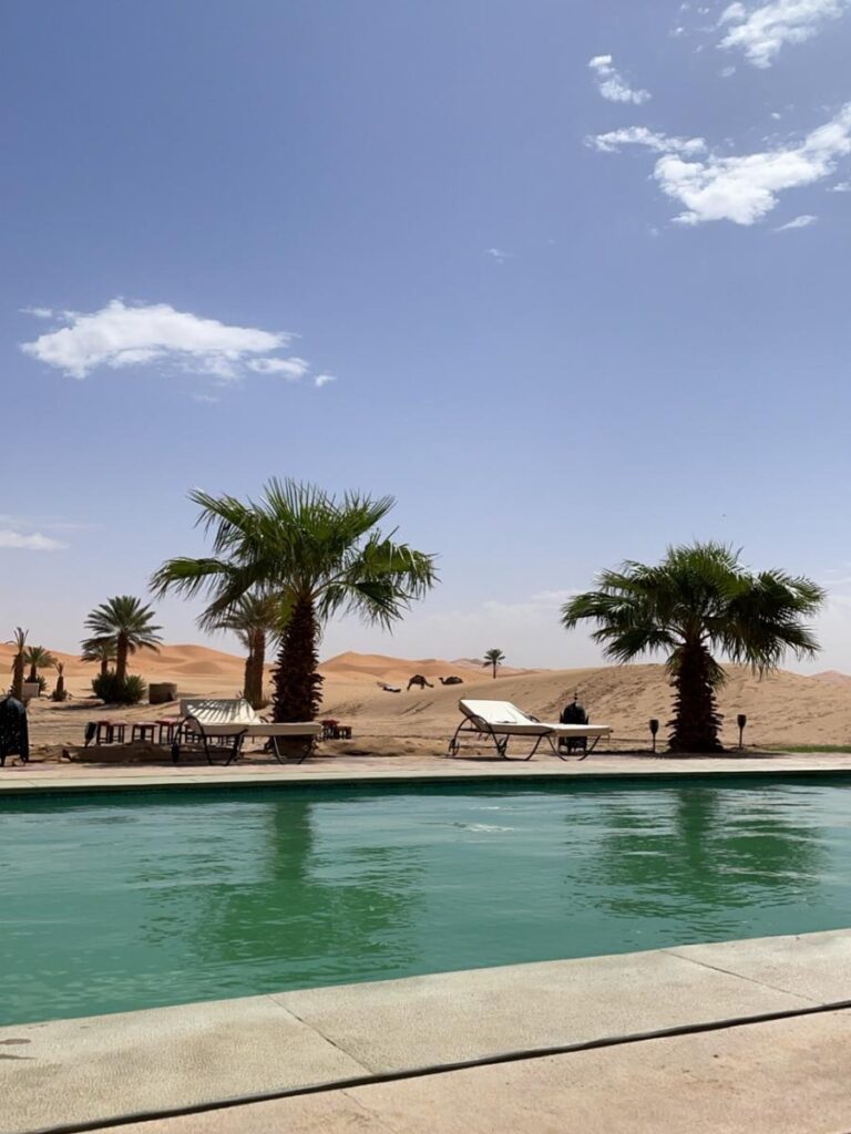 Na de indrukwekkende reis kwamen we aan in Merzouga, een klein dorpje dat direct aan de rand van de uitgestrekte Sahara ligt. Wij kozen ervoor om te verblijven in het prachtige Kanz Emmeral. Het mooiste aan dit verblijf was zonder twijfel het zwembad met direct uitzicht over de uitgestrekte zandduinen van de woestijn. Zonder twijfel de perfecte plek om even bij te komen van de drukte in Fez.