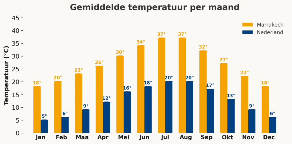 De zomermaanden (juli en augustus) kunnen in Marokko extreem heet worden. De temperaturen kunnen in sommige plaatsen oplopen tot wel 45 graden, iets te heftig naar onze mening. Wie liever wat koeler weer heeft kan ook in mei of oktober een heerlijke rondreis maken, met nog steeds volop zon.